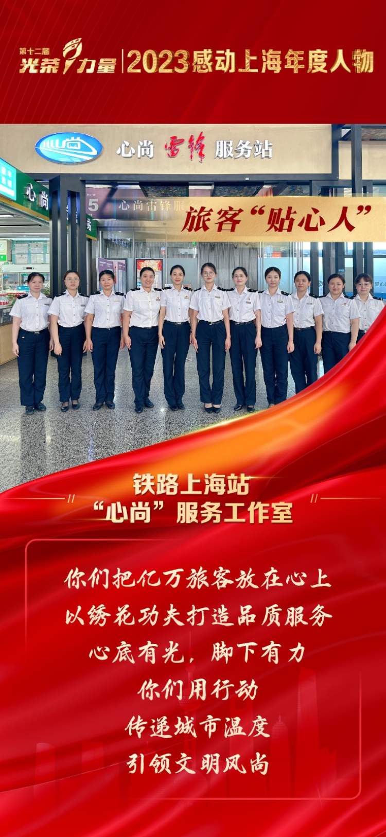11.铁路上海站“心尚”服务工作室成立于2015年,分设于上海火车站、上海南站、上海虹桥站,是致力于为旅客提供暖心帮扶的团队,每日为旅客提供日常问询解答、老幼病残重点服务、遗失物品快捷查询、免费租借轮椅担架等多项便利服务。在大上海保卫战中,团队成员坚守70多天,做好援沪医护人员接送和物资转运工作,共服务医疗队40批、1.7万人,协助运输医疗物资24批、2.9万吨,核酸样本12批、131.2万份。现如今,团队已成为守初心担使命的红色文化阵地、彰显新时代劳动者精神风貌的舞台和洋溢社会文明新风的窗口。曾获全国五一巾帼标兵岗、全国用户满意服务明星班组、中华全国铁路总工会“火车头奖杯”、上海市工人先锋号等。