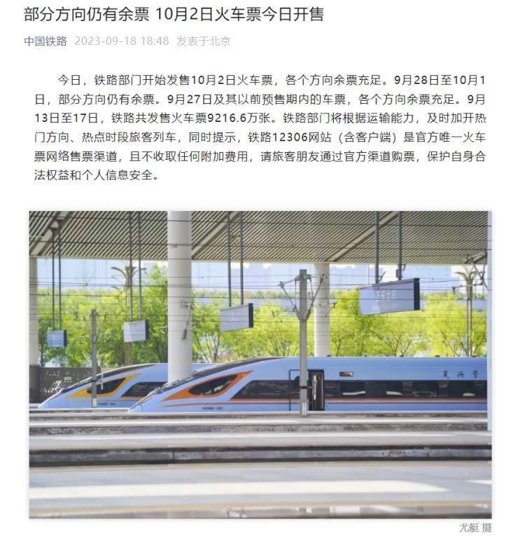 截至铁路部门10月2日有关消息,目前各个方向余票充足。9月28日至10月1日,部分方向仍有余票。9月27日及其以前预售期内的车票,各个方向余票充足。9月13日至17日,铁路共发售火车票9216.6万张。