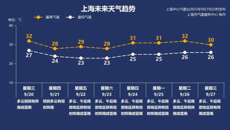 周三(9月20日):多云到阴有阵雨或雷雨,27-32℃