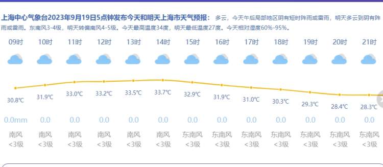 预计今天白天申城最高气温将达34℃。今天全天以多云天气为主,午后局地阴有短时阵雨或雷雨,东南风3~4级,相对湿度95%~60%。防暑降温的同时注意提防午后局地对流天气。