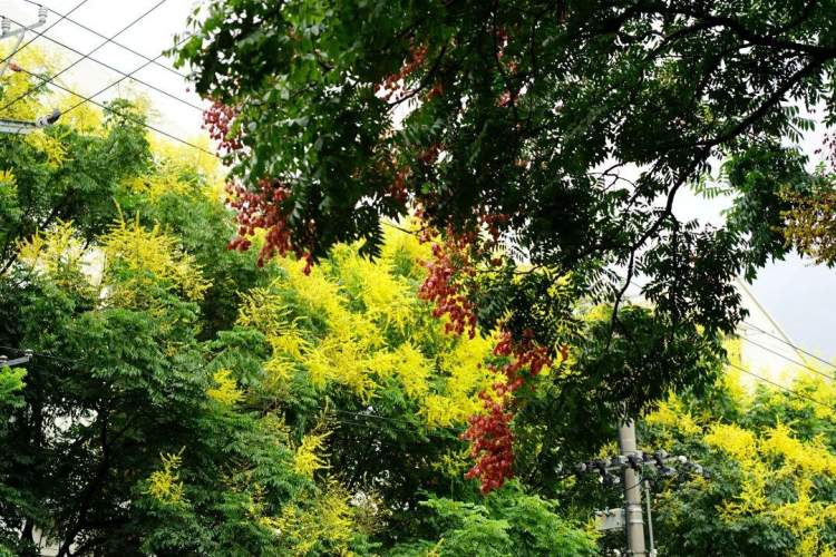 地面上、车顶上,最近,你是不是到处都发现落了一地的黄色小花。是桂花吗?不,它们是栾树的花。过不了几日,栾树就会“卸”下一树黄花,结出紫红色果实,带来另一种色调的风景。去年,在博主们的力捧下,地铁3号线大柏树站因窗外的栾树可是成了网红地铁站哦。