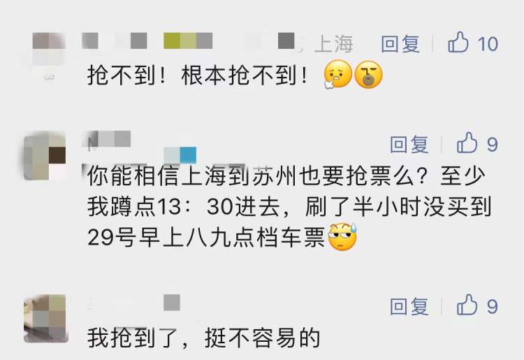 网络上,也有一大波人表示,没有抢到票。铁路部门提供的数据显示,9月15日,全国铁路发售火车票2287.7万张,创下单日售票历史新高。从9月13日至17日预售情况来看,9月28日至10月1日,上海至武汉、上海至长沙、上海至郑州、上海至无锡、上海至南昌、上海至连云港、上海至阜阳、南京至杭州、北京至郑州等方向车票紧俏,部分时刻点好、速度快的车次更紧张。