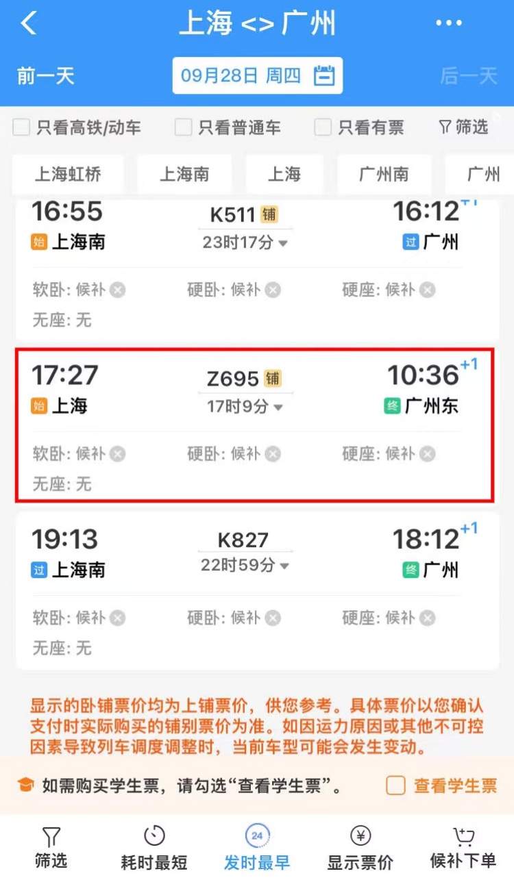 9月14日车票开售当天,9月28日晚从上海出发的3趟卧铺车车票全部秒光,三个家庭连一张票都没有抢到。其中,从上海站出发的一趟车时间最短,更是连候补席位都已满。“铁路部门不是一直倡导我们用候补功能嘛,结果是连候补的机会都没有,不但车票秒光,连候补席位都秒光。”同行的曹先生感叹到。