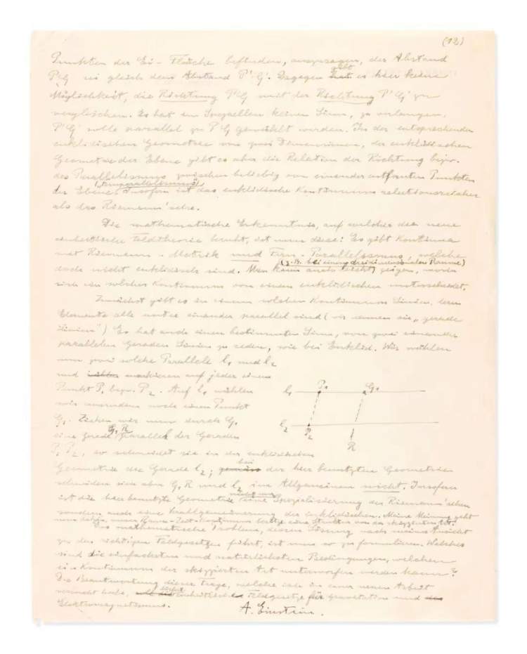 佳士得专家表示,这份手稿是爱因斯坦于1929年受《纽约时报》委托,用德文撰写的关于他毕生科学研究的总结。手稿共14页,12个单张,有2张是分别写在纸的正反面。