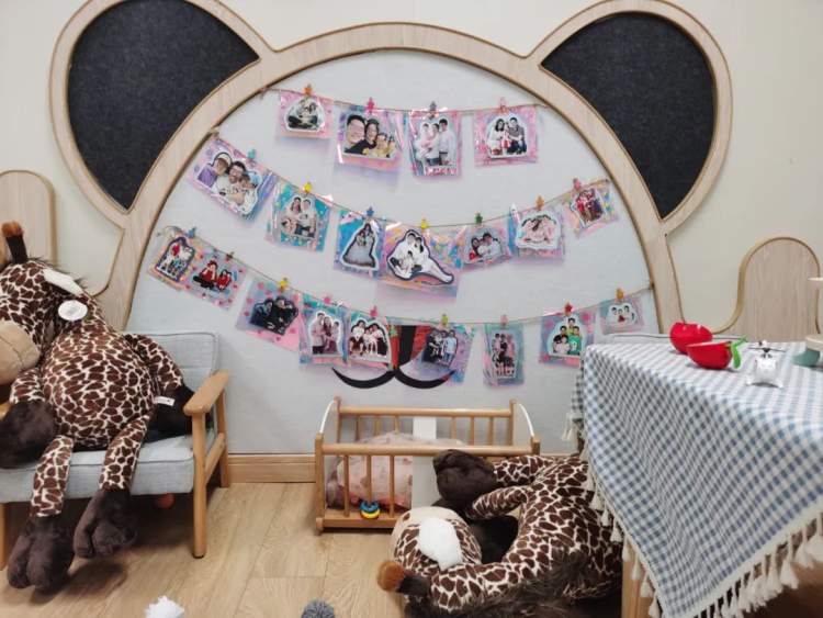 教室内也进行了重新布置,更新了适合托班宝贝的教具、玩具,还设计了一些特别的小角落。比如,挂上每位宝贝的全家福,宝贝想爸爸妈妈时,可以对爸爸妈妈说说话。再比如,拆除小马桶之间的门板,换成熊猫图样的小隔板,上面还安装了求助铃。马桶边增设了一个生活角,用来放置每个宝贝的拉拉裤,让他们有个适应的阶段。