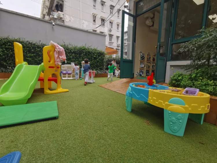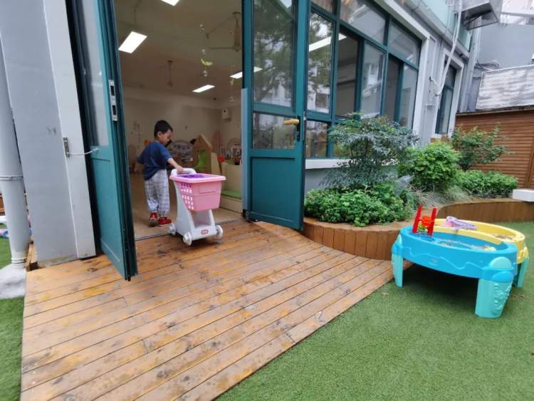 首先,要打造一处适合托班宝贝的托育活动场地。经过综合考虑,一楼的两间教室被选中。这两间教室宽敞明亮,和小花园打通,宝贝们一出门就置身于户外空间,挖沙、玩水、爬滑梯、捡拾落叶、摆弄石头……享受新鲜空气和阳光,充分保证了每天户外活动时间不少于2小时。