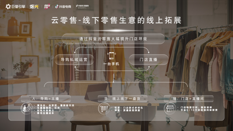 抖音电商相关人士表示,关于云零售,2023年有超过150家品牌入局,2000多家开播门店。“一人一店一手机”,在人、货、场上,让导购变身主播,让现货“往上翻”,让门店变成直播间,以更高效的组织结构落地运营。商家只需一部手机在店里开播,就能做成“两种生意”。