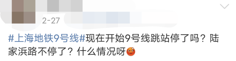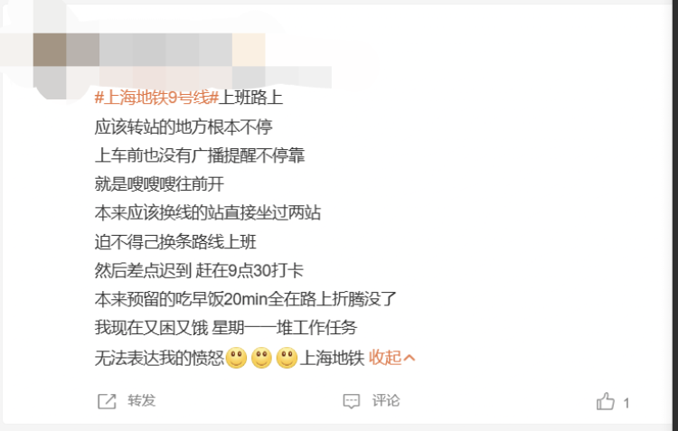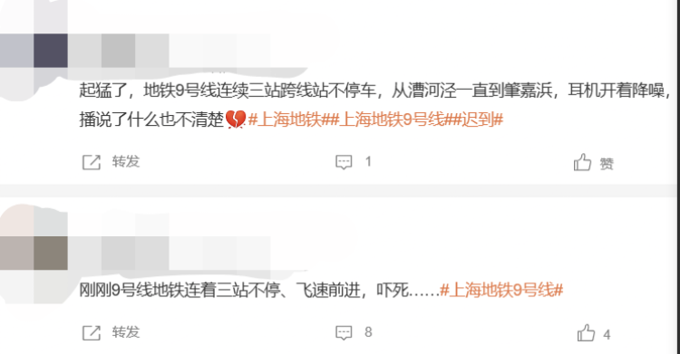 近日,多位网友发微博表示,早高峰时段乘坐9号线时,遇到地铁连着三站不停车,从漕河泾一直到肇嘉浜路站,中间还有需要换线转站的站点,因为这一情况差点上班迟到了。