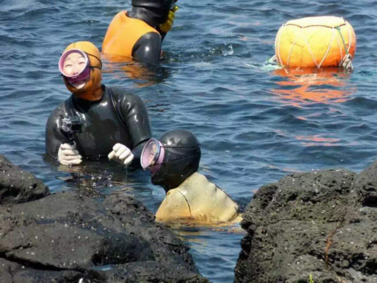 韩国海女沿用古老的徒手采捕方式,没有重重的氧气罐、头盔,一副泳镜、一身防水硅胶泳衣是他们唯一的装备。“海女”下海捞海参,她们都有下水的各类许可证书,可以不借助氧气瓶等潜水工具长时间作业,肺活量高的“海女”能在水下坚持三分多钟。