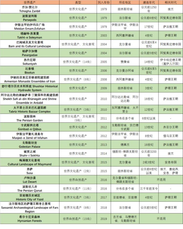 在联合国教科文组织世界遗产中心收录的遗迹之中,伊朗的24个文化遗址位列其中,其中包括宫殿、集市、礼拜场所、古代水系等,位于世界第10。