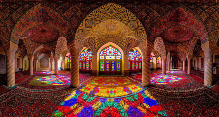莫克清真寺又称为粉红清真寺,整个清真寺非常鲜艳,寺内的祈祷厅中间有十多根斜蛇纹柱子撑起整个大厅,每根柱子上都雕刻着复杂的图案,每当阳光透过花窗射入进来,直接洒在精美的波斯地毯上,周围的一切都染成了粉红色就会被绚丽光影所震撼到。