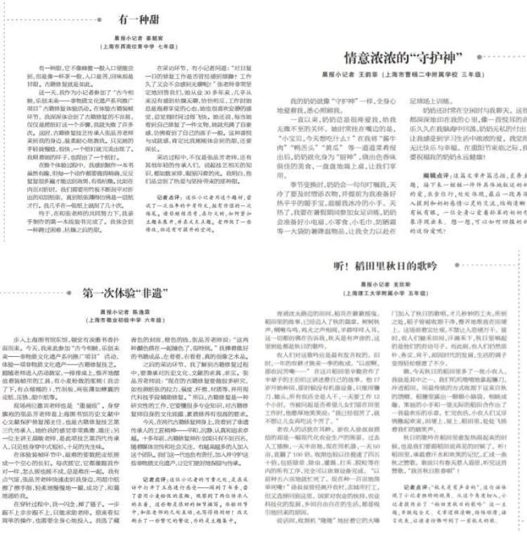 这些文章均刊发于《新闻晨报》版面,经过循序渐进的训练,不论是写人,还是叙事,孩子们的写作越来越有章法,有些同学甚至挑战起中考同题作文。