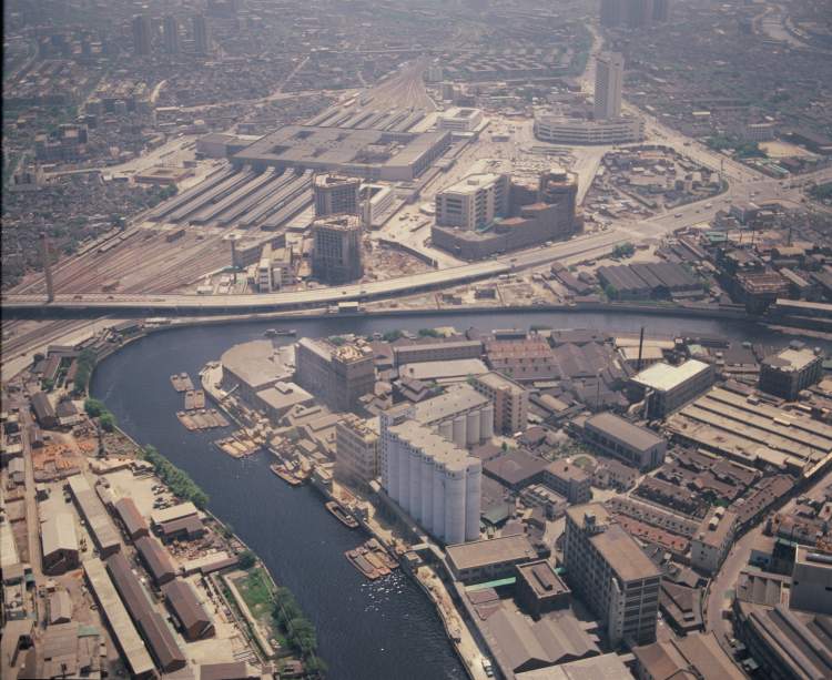 20世纪90年代,苏州河莫干山路周边航拍。上海面粉厂巨大的筒仓十分醒目(陆杰摄)
