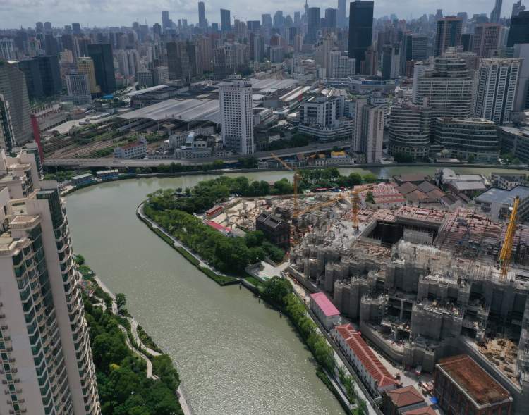 2023年,几乎相当视角的苏州河莫干山路周边航拍,天安千树二期正在建设中(陆杰摄)
