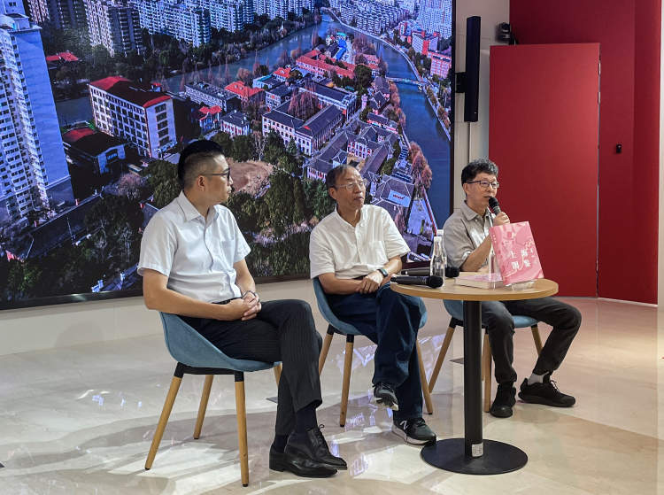 9月16日,《上海图鉴:苏州河》首发式上,复旦大学教授于海(中)、摄影师陆杰(右)、该书主编沈思睿(左)与读者座谈