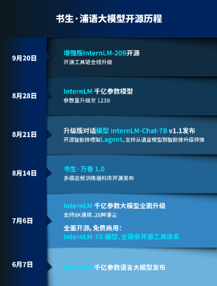 书生·浦语(InternLM)大语言模型由上海人工智能实验室联合多家机构共同推出。今年6月,InternLM千亿参数(104B)语言大模型首次发布,现已经历多轮升级;7月,上海人工智能实验室开源书生·浦语70亿参数的轻量级版本InternLM-7B,且在业内率先开源贯穿数据、预训练、微调、部署和评测的全链条工具体系。InternLM-7B也已上线魔搭社区。