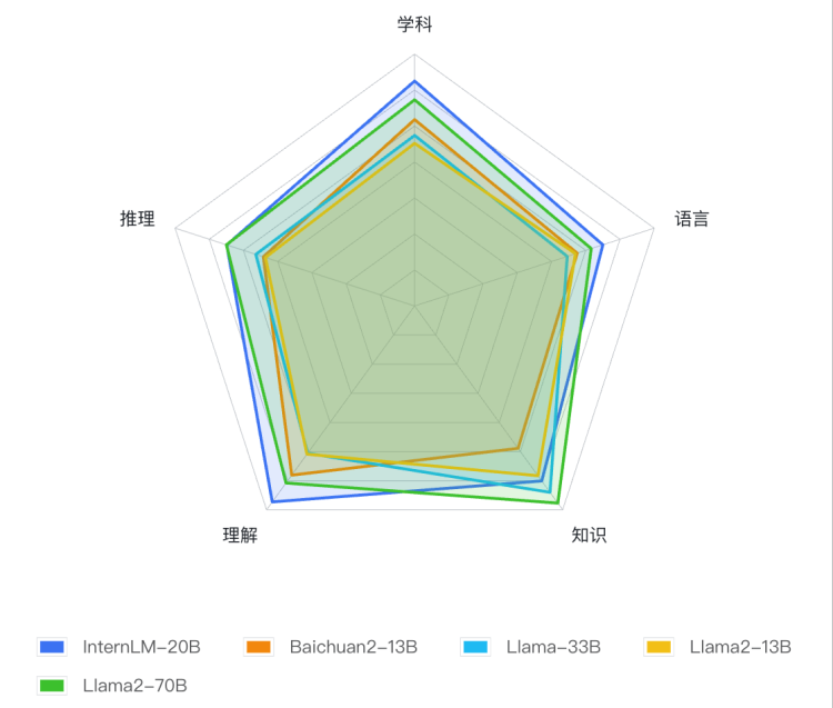 优异的综合性能,通过更高水平的数据清洗和高知识密度的数据补充,以及更优的模型架构设计和训练,显著提升了模型的理解、推理、数学与编程能力。评测结果显示,InternLM-20B在全维度上领先于开源13B量级模型,平均成绩明显超越Llama-33B,以不足三分之一的参数量,评测成绩达到了被视为开源模型的标杆Llama2-70B水平。