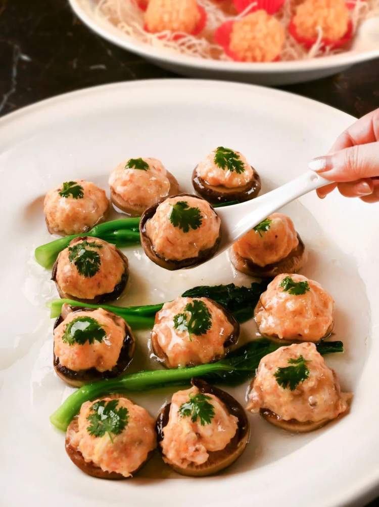 虾蟹香菇塔是取材Q弹的虾肉与鲜美的蟹粉,上层虾、蟹的鲜味与底层香菇特有的香气巧妙融合。
