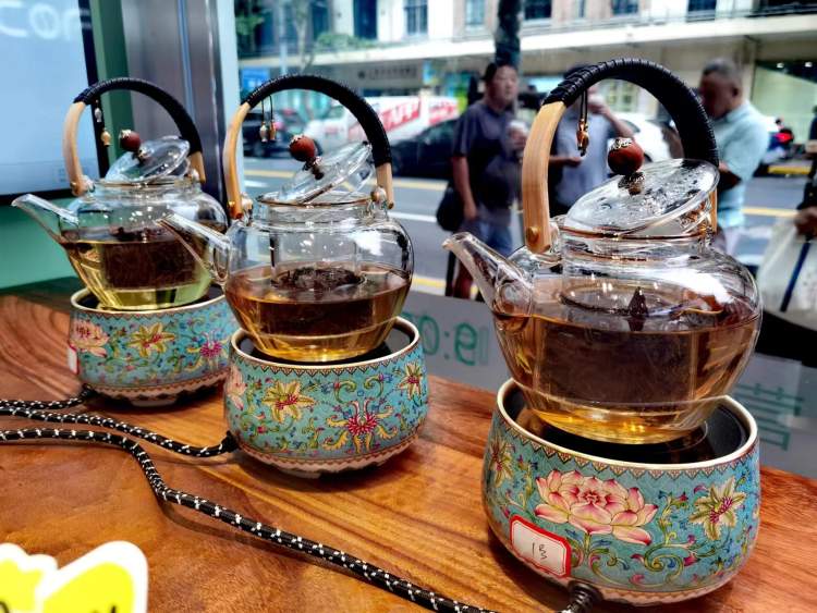 现场可见,茶品区的柜台上精致小炉煮着一壶壶澄透清香的美茶,店员不时穿梭期间添水倒茶,为顾客提供试饮。