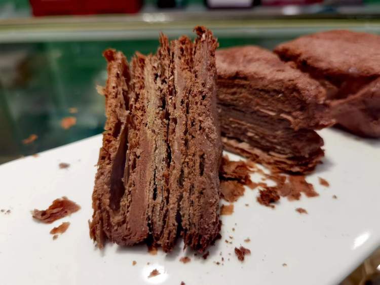 备受欢迎的巧克力拿破仑,不仅有喷香的巧克力馅,而且酥皮内同样融入了巧克力,横切开后层层分明,十分诱人。店员表示,由于是纯手工制作,限量供应,每天大概卖出四五十个,卖完即止,还想要只能第二天赶早了。