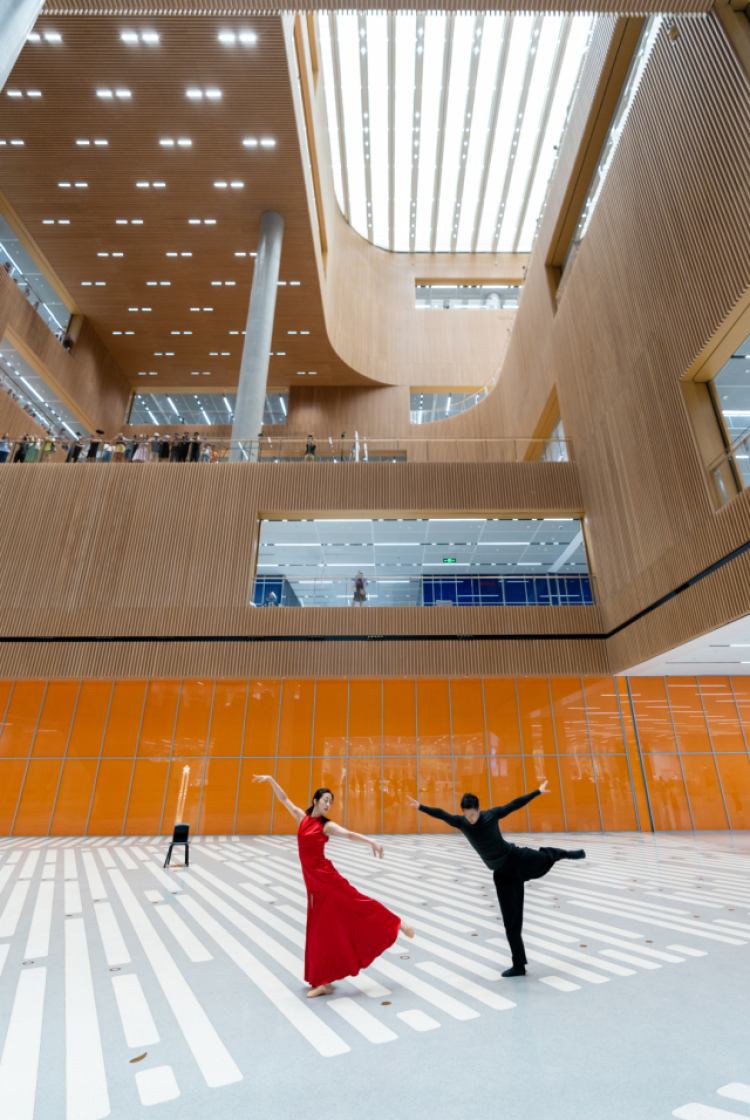 华军、侯颖两位舞者在3楼和1楼中庭翩翩起舞