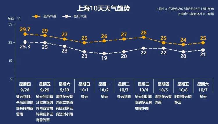 9月29日,假期首日,也是中秋节当天,上海云系较多,午后局部地区有阵雨或雷雨。气温25~29℃,偏东风3~4级,相对湿度95%-65%,闷热感犹在,出行游玩没有太大影响。但因云层较厚,有弱降水,夜间赏月条件不够理想,也许就只能期待月亮惊喜地露个小脸吧。