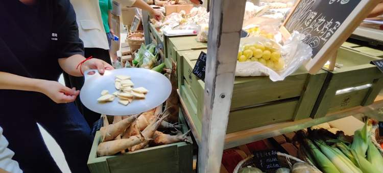 益点田生态农场也在此落地上海首家限时mini体验店,提供丰富的有机生态农产品,记者在现场尝到了能生吃的笋,吃起来像是水果,但是又有竹笋的味道,很特别。
