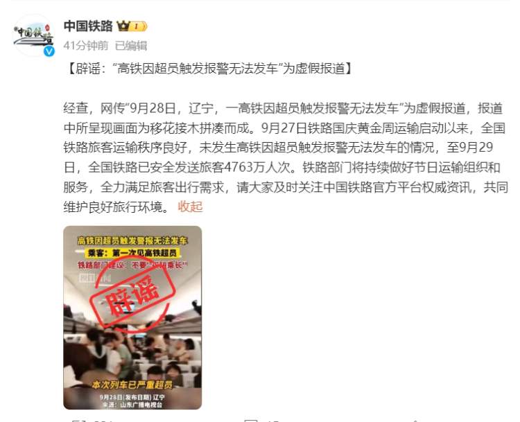 @中国铁路 表示,经查,网传“9月28日,辽宁,一高铁因超员触发报警无法发车”为虚假报道,报道中所呈现画面为移花接木拼凑而成。