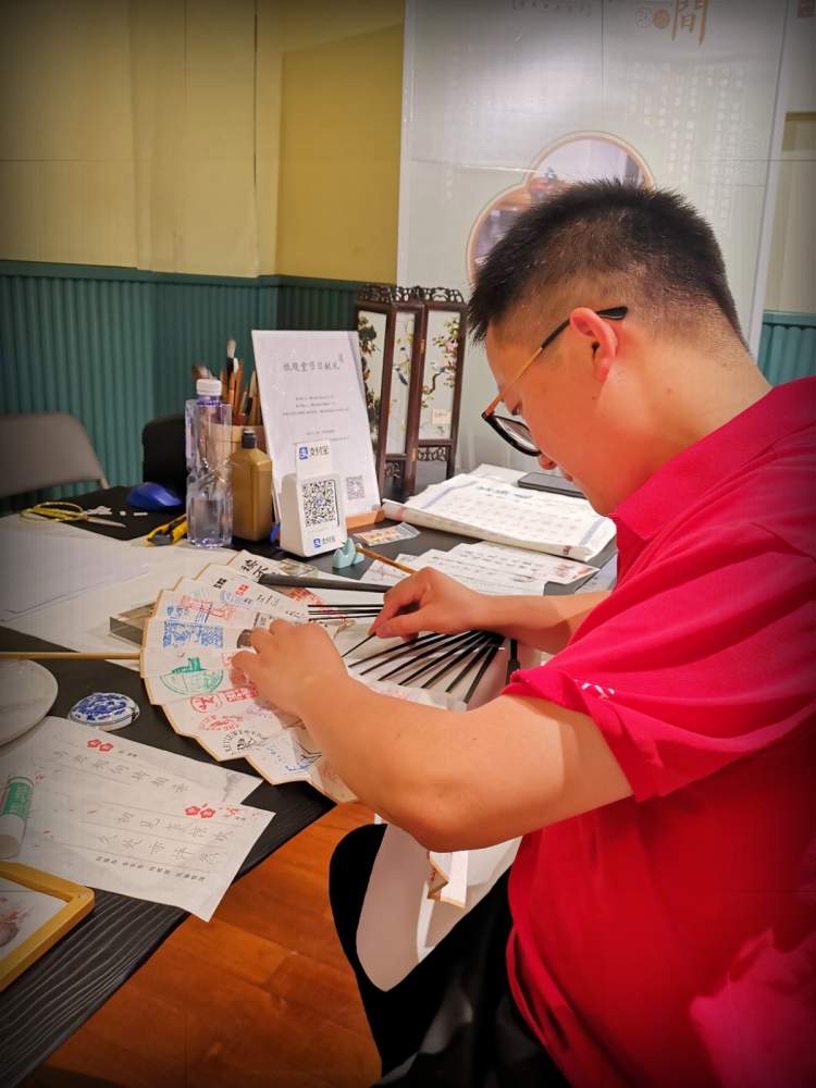 李奎是一位资深书迷,他是上海某医院的普通医务工作者,酷爱阅读。书店节在复兴公园开幕之前,李奎第一时间就到了现场,在一些书店摊位上,他兴致勃勃地给自己带去的一把新扇子集章。