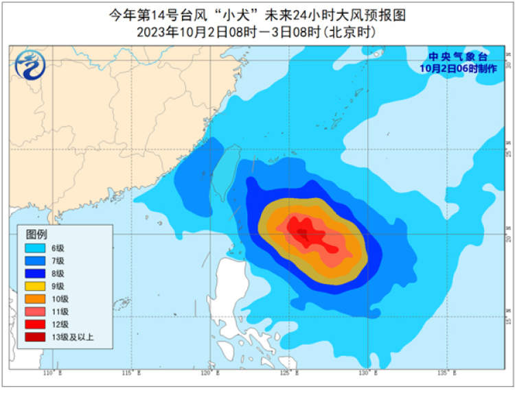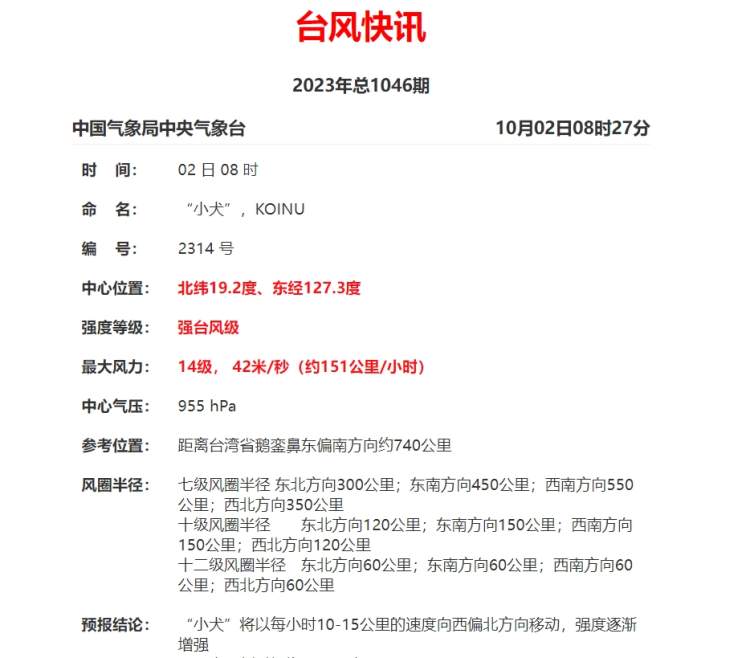 据中央气象台消息,今年第14号台风“小犬”(Koinu)昨晚由强热带风暴级加强为台风级,今晨(10月2日)又加强为强台风级。