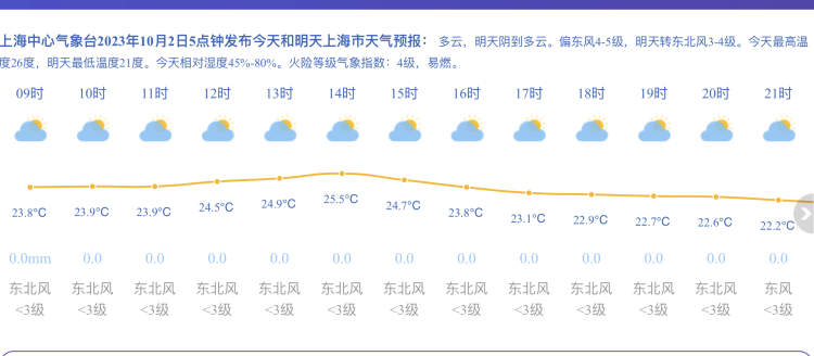 今天上海延续多云的好天气,早晚更凉一些,早间市区最低气温在20℃附近,郊区大多在15~20℃之间。吹的是偏东风,风力有4~5级。由于风力较大,云量较多,预计白天最高气温在26℃附近。相对湿度80%~45%,空气比较干燥,注意及时补充水分。