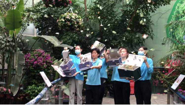 走进上海动物园两爬馆,一只只美丽的蝴蝶被放飞在花园里。它们或在三角梅上吮吸花蜜,或在天花板上向光飞舞。这里,放飞了青凤蝶、碧凤蝶、玉带凤蝶、金斑蝶、虎斑蝶等20余种乡土活体蝴蝶。