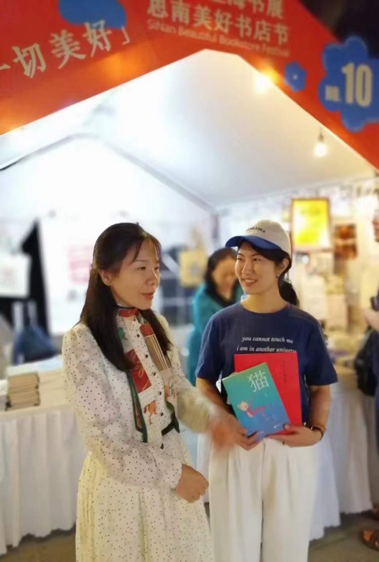 四天的美好书店节结束了,累而快乐着……今天(10月1日)准点直播,万燕老师带来了两名学生志愿者。现场总是出人预料,万燕老师的小姨来了,她们约两年未见,着绿衫戴着草帽的小姨,《猫》看过三遍,她很喜欢。聊几分钟,便有购书者请签名,有从合肥来上海旅游的,第一次来美好书店节,第一家店就选鹿鸣,因为有作家来分享;万燕老师多年前的学生,她就在斜对面的华东理工大学书店,师生重逢,彼此惊呼。《画说红楼梦》是被翻阅最多的,很受女生喜爱,有藏书票,有120幅马小娟画的插图,一版一印,仅3000册,极具收藏价值,一本又一本被带走。