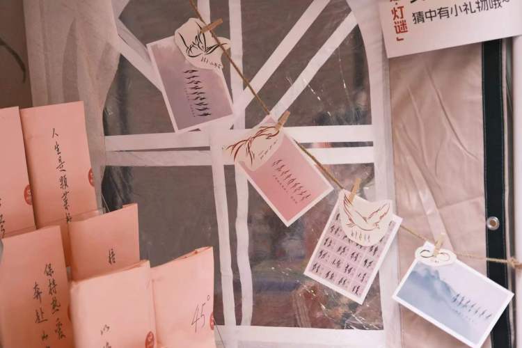 女书是唯一一种女性文字,我们用她设计了帆布袋、纹身贴和名字片。女书福袋是用布袋装了女性盲盒书籍,139元/袋,最后两天卖了很多。女书福袋受热捧,女孩子们最后挑到了最后。最让人感动的一位小男孩给妈妈选了一个福袋做礼物,小男孩看起来刚上小学的样子,他选择的盲盒书袋提示语是“聊聊吧”,超级可爱。