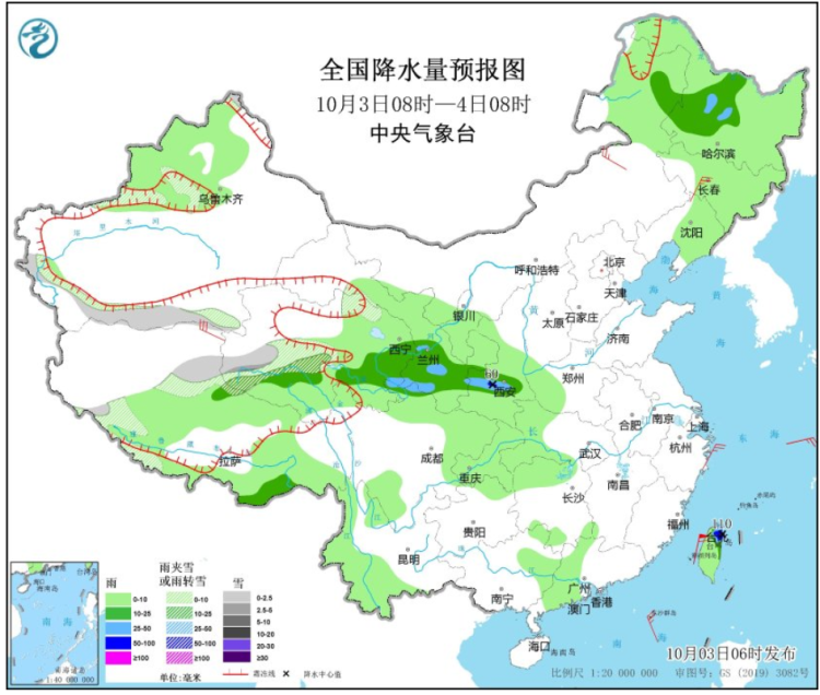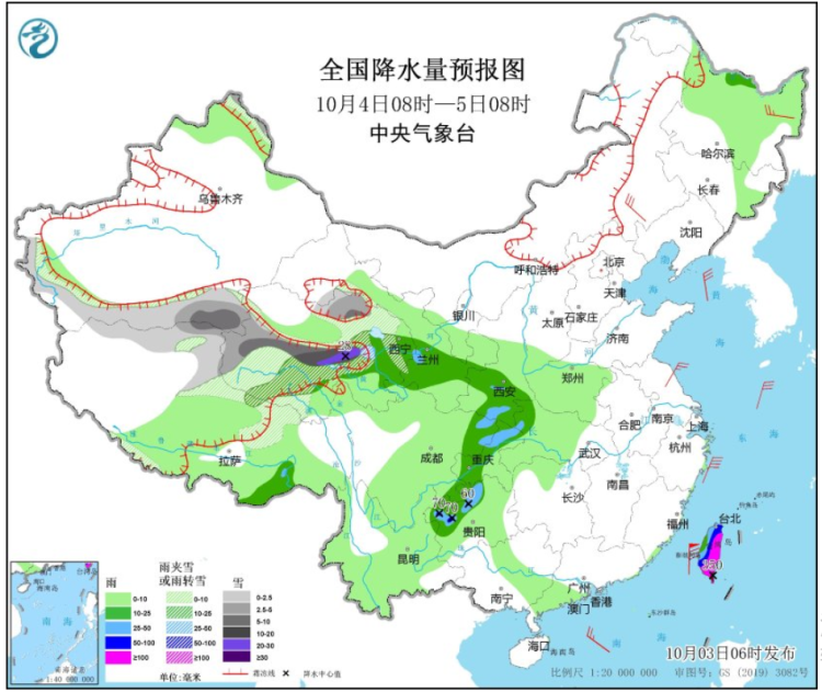 10月3日08时至4日08时,新疆北疆高海拔地区、沿天山高海拔地区、南疆南部山区、西藏西南部和北部、青海中西部等地部分地区有小到中雪或雨夹雪;西藏北部和东南部、青海中南部和东部、甘肃中南部、陕西中部、内蒙古东北部、黑龙江中西部等地部分地区有中到大雨,其中,陕西关中盆地局地有暴雨(50~60毫米)。内蒙古中东部、吉林中北部、西藏北部等地部分地区有4~6级风,东海南部及钓鱼岛附近海域、台湾以东洋面、巴士海峡、台湾海峡、南海东北部以及浙江南部沿海、福建沿海、台湾岛沿海将有6-8级大风,台湾岛东南部海面的风力将有9-12级(见图1)。