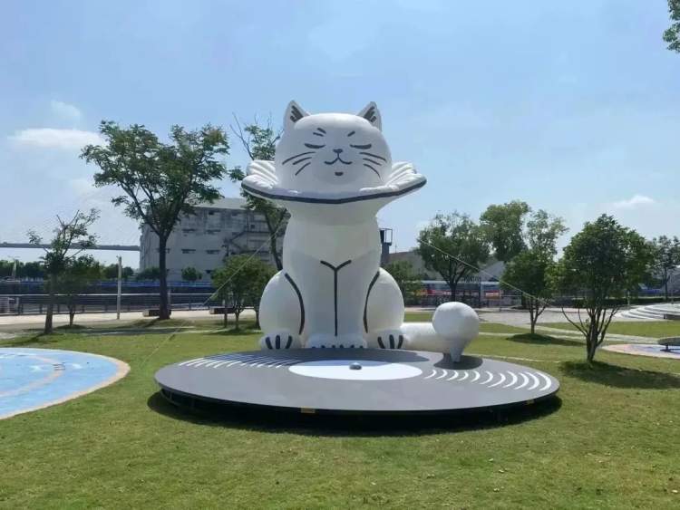 在展馆与滨江之间的室外草坪上,一只高达6米的“白猫留声机”装置吸引了不少人的目光,闻声而动的拍照达人已经率先将这只猫“装”进了相机里——白色猫咪脖子上戴着一个伊丽莎白圈,蹲坐在留声机旁,而它的尾巴充作了留声机的唱臂。