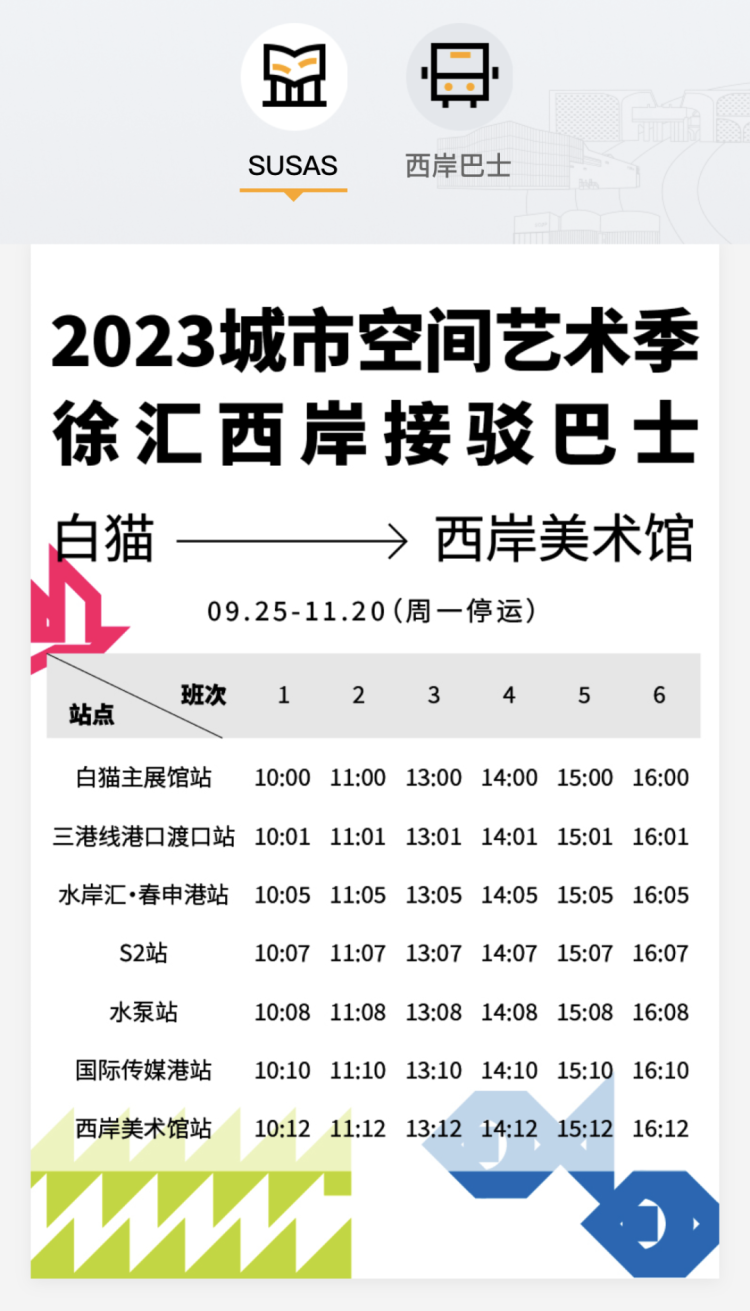 如果觉得从白猫主展馆一路向北步行有点吃力的话,西岸接驳巴士特别开放SUSAS BUS 专线,在白猫主展馆与西岸美术馆两个站点间往返,设有西岸美术馆站 、国际传媒港站、S2站、水岸汇·春申港站、三港线港口渡口站、白猫主展馆站等6站。具体班次时间可以关注西岸区域个人生活服务小程序“西岸生活”进行查阅。