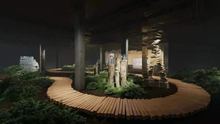 白猫主展馆的一层被改造成半开放式、半下沉的“生境花园”,即使是在建筑外围走过也能窥见里面的生态一隅。拾级而下,宛若一步步走进童话中的森林——