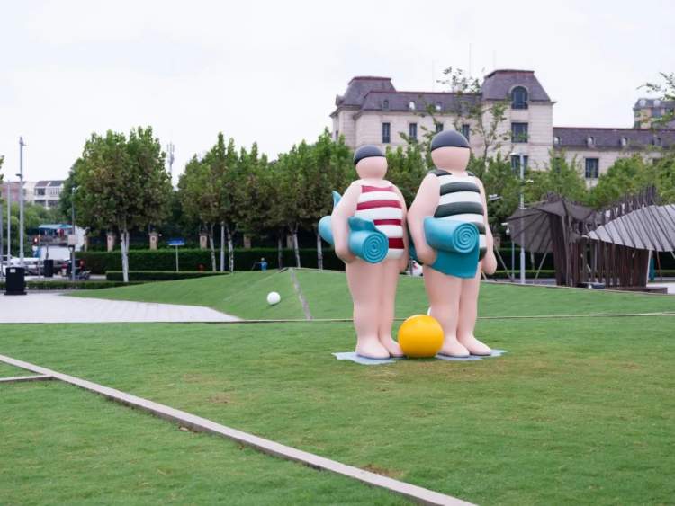 法国艺术家夫妇克莱达特&佩蒂皮耶带来的作品《沐浴者》,再现了想象中的海边场景——两座人偶雕塑身着条纹泳衣,携着两条蓝色毛巾和黄色的球,目视着前方的黄浦江,好似下一秒就要在跳入江水中嬉戏。