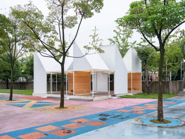 高目建筑创作的《河图洛书亭》以中国文化源头的河图洛书为依凭,将空间划分成九格,“被切割”成8个三角体的屋顶也根据河图洛书所代表的星象面朝不同的方向。无论是在亭子间里或站或坐,只要抬起头,都能透过中间屋顶的窄窗望向深空,感受“蜉蝣”与“天地”的相融相生;