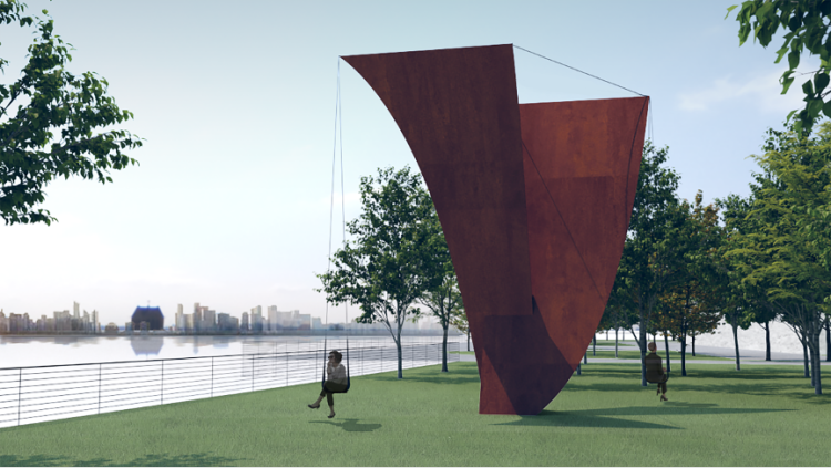 在江畔,一个矗立着的“巨型天平”特别吸睛。两块棕色钢板呈“V”字型“破草坪而出”,两端分别悬挂着一个座椅……原来这是建筑师刘阳创作的一个互动装置《进山的孩子》。