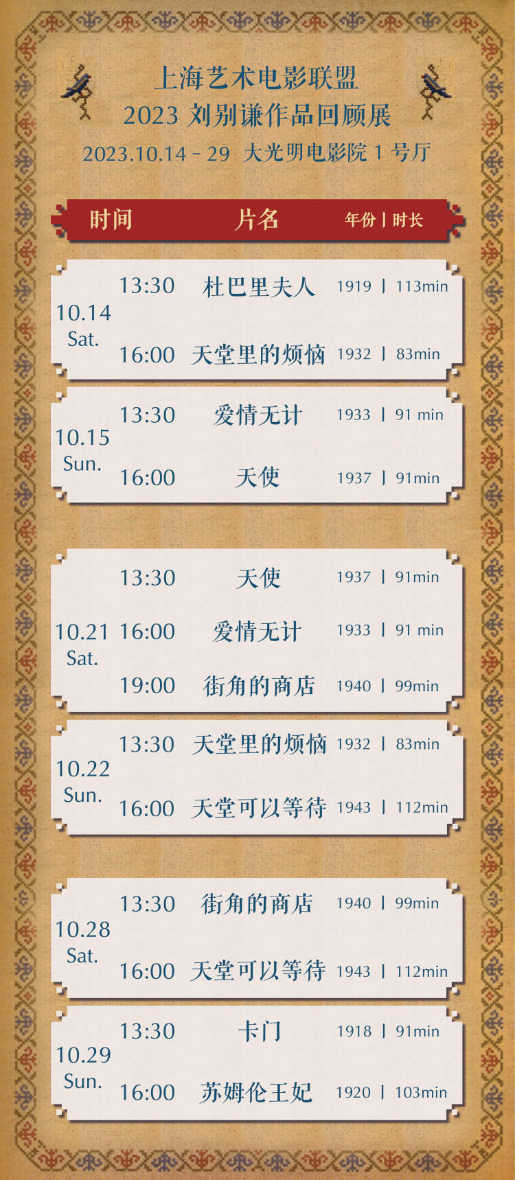 这个月,上海艺术电影联盟于10月14日至10月29日在大光明电影院举办刘别谦作品回顾展,在优选最佳放映介质的前提下,将展映8部刘别谦的默片与有声片,尽可能展现刘别谦的创作准全貌,系统地展现他的精彩电影时光,向这位伟大的电影大师致敬。