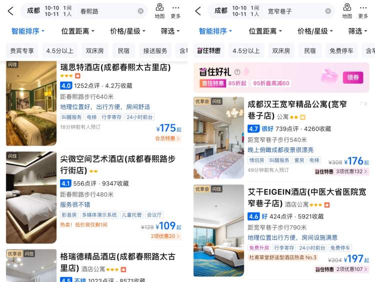 记者今天在携程上搜索发现,春熙路、宽窄巷子等热门景点的酒店床位空余较多,价格从百元至千元不等,无论是手头紧或是宽裕的游客,都有足够多的选择空间。