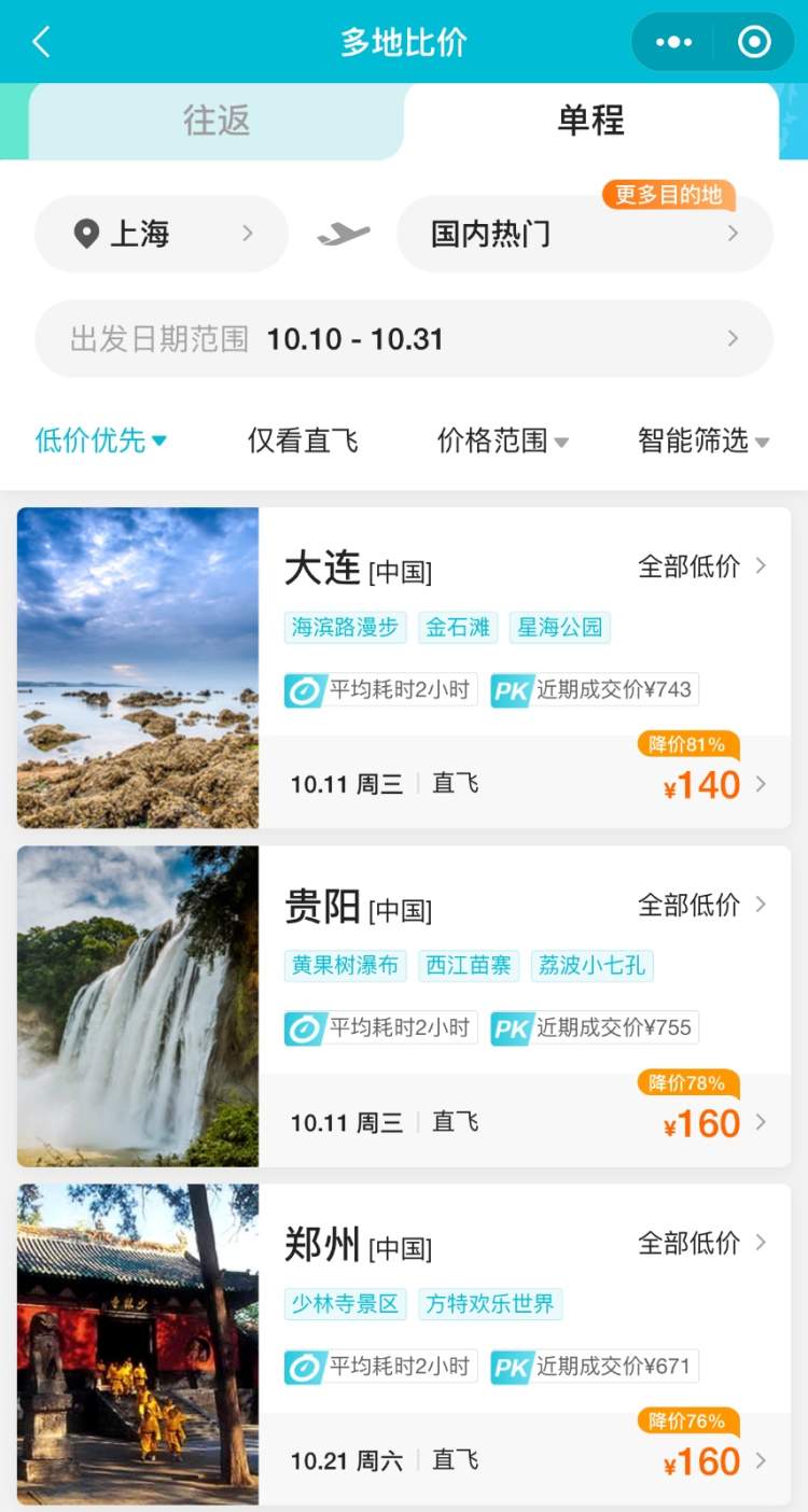 记者对比多个旅行平台发现,假期后至本月底的机票平均支付价格较“双节”期间降低近四成。在去哪儿平台上搜索后显示,即日起至本月底从上海出发,飞往大连仅需140元,飞往贵阳、郑州、重庆都只需160元,即使加上机建燃油费,机票价格也远低于乘坐高铁的费用。