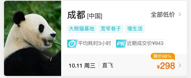 记者搜索发现,假期后从上海飞往成都的机票也“大跳水”。去哪儿数据显示,该条航线的最低价格仅需298元,而其近期成交价为943元,降幅约占68%。记者在春秋航空APP上看到,10月14日至17日期间从上海飞往成都的最低价格更是低至259元。