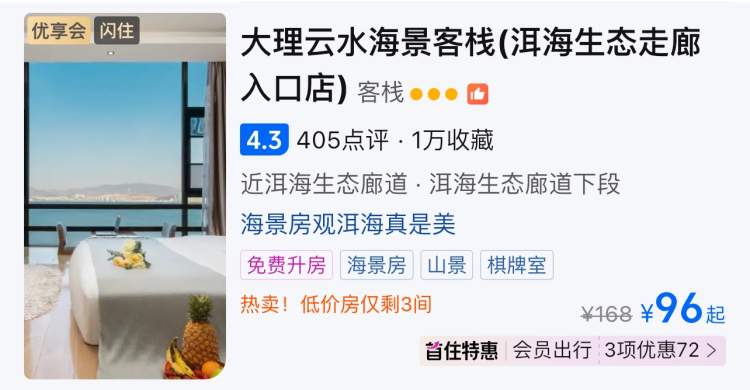 此外,现在去三亚、大理、乌鲁木齐等国内热门城市的酒店费用也相当实惠,如果考虑到性价比的老友们,仅仅是千元内的价格区间就会让人“挑花了眼”。其中,大理的海景房最低只需96元一晚便可近观波光粼粼的辽阔洱海。