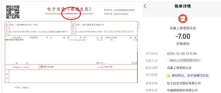 发票开票方为上海卡露雷食品有限公司,收款方为鸟真老码头