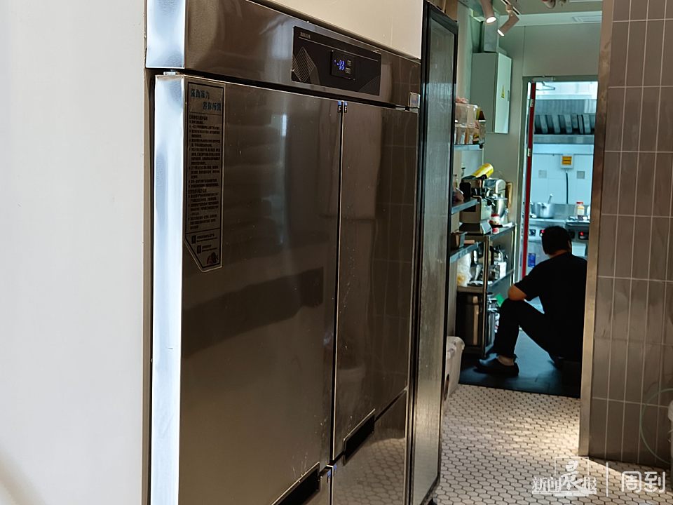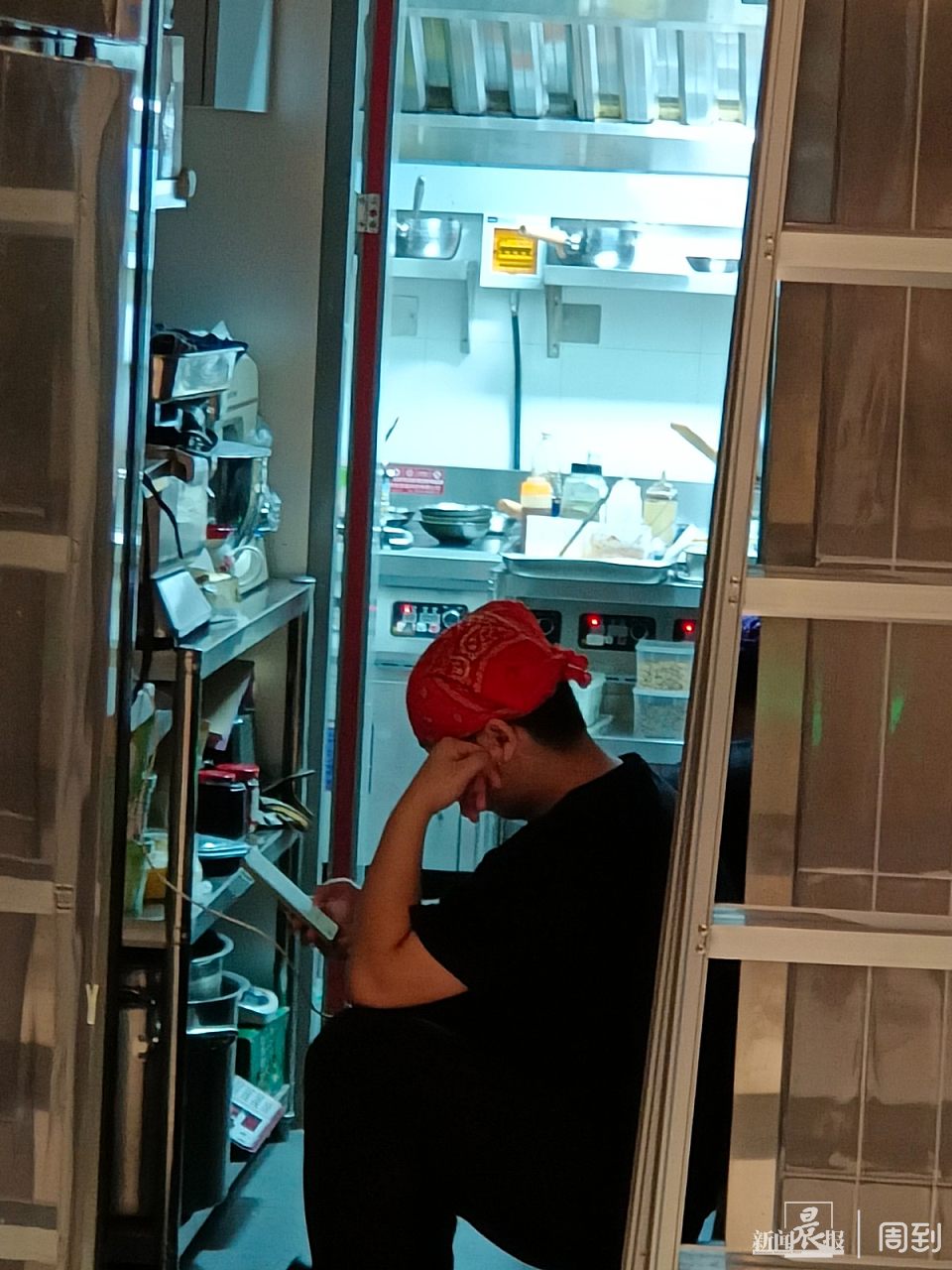 厨房后厨,一位员工正在看手机休息