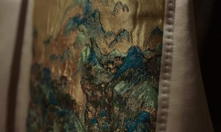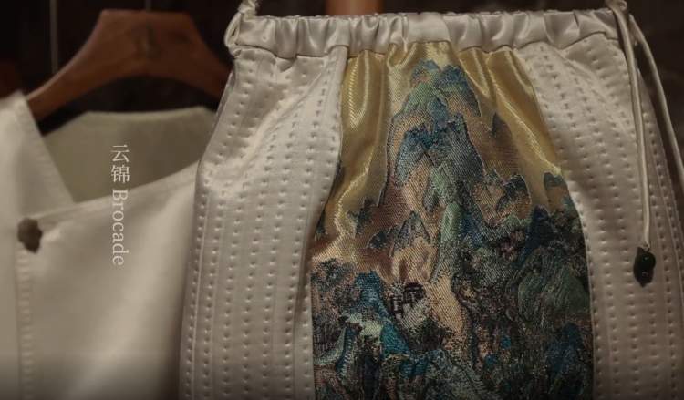 云锦这一织造工艺很贵,因此我们在一个很小的面积上去实现千里江山图的图案,通过设计把图案完美融入到整个服装中,既充满宋画风韵,也能让更多人能介绍这件衣服的定价。