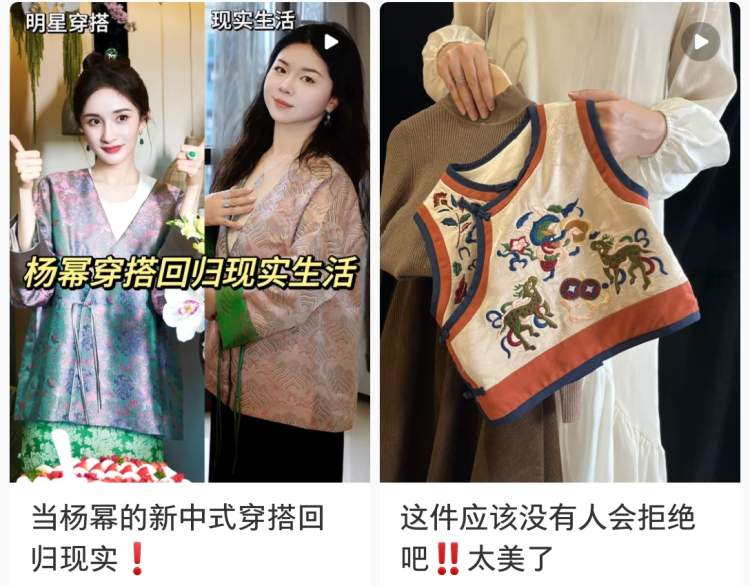 在社交平台上,杨幂的宋锦外套也成为不少人尝试的热门穿搭。
